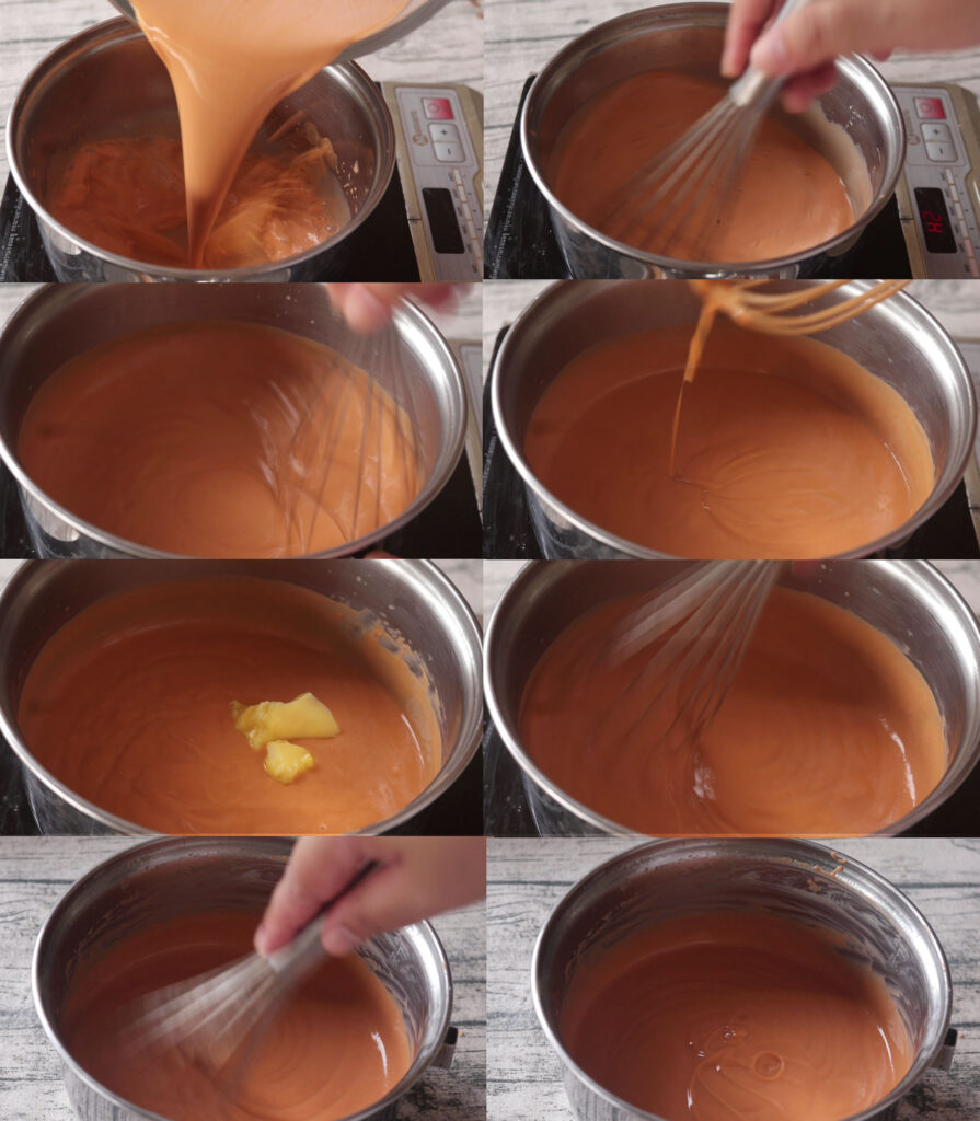 4. นำไปกวนด้วยไฟอ่อนจนเนื้อสังขยาข้นขึ้น และจะเห็นเป็นริ้วตะกร้อ จากนั้นดับเตาใส่เนยสดลงไปแล้วกวนต่อจนเข้ากัน