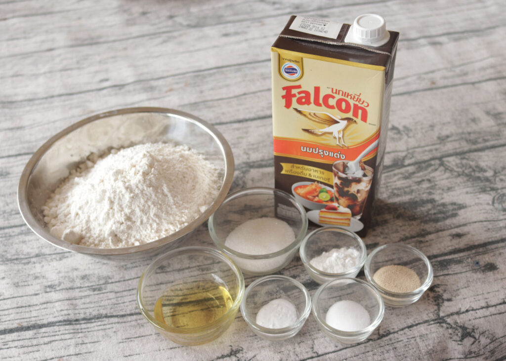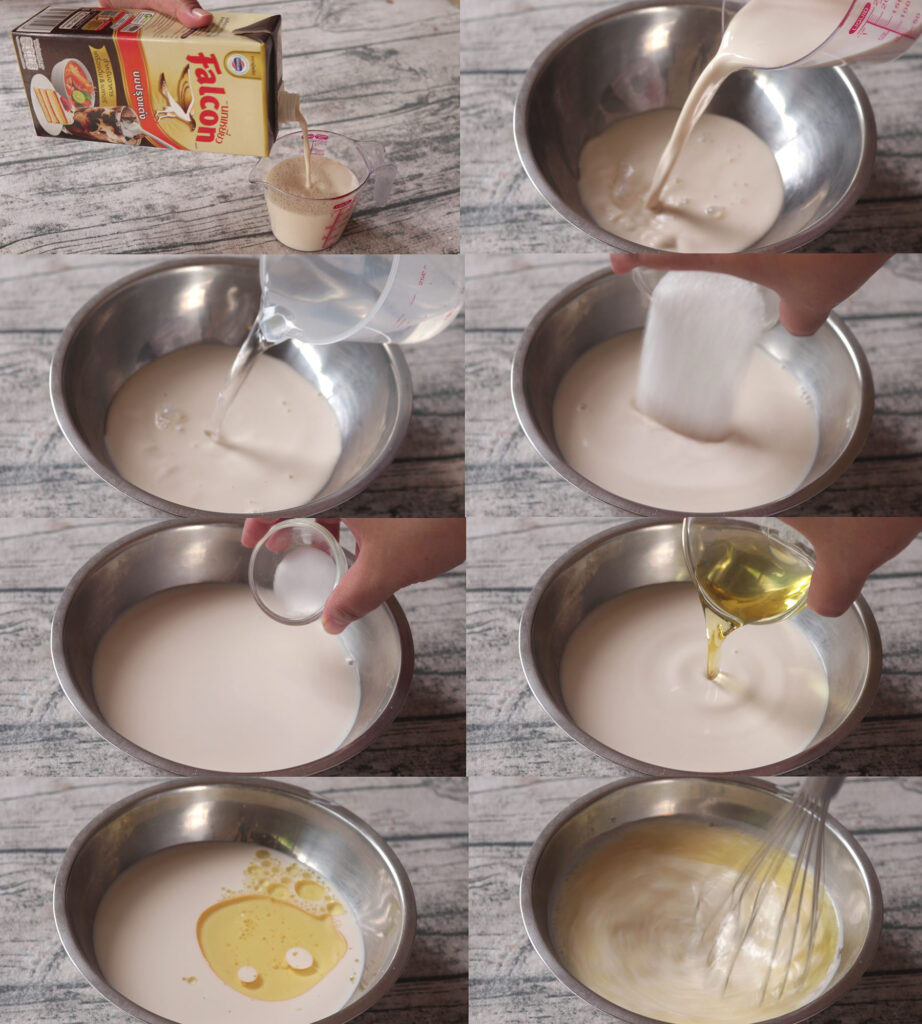1. ผสมนมข้นจืดตรานกเหยี่ยวฟอลคอน +น้ำอุ่น+น้ำตาลทราย+เกลือป่น+น้ำมันรำข้าว แล้วคนให้ละลายเข้ากัน
