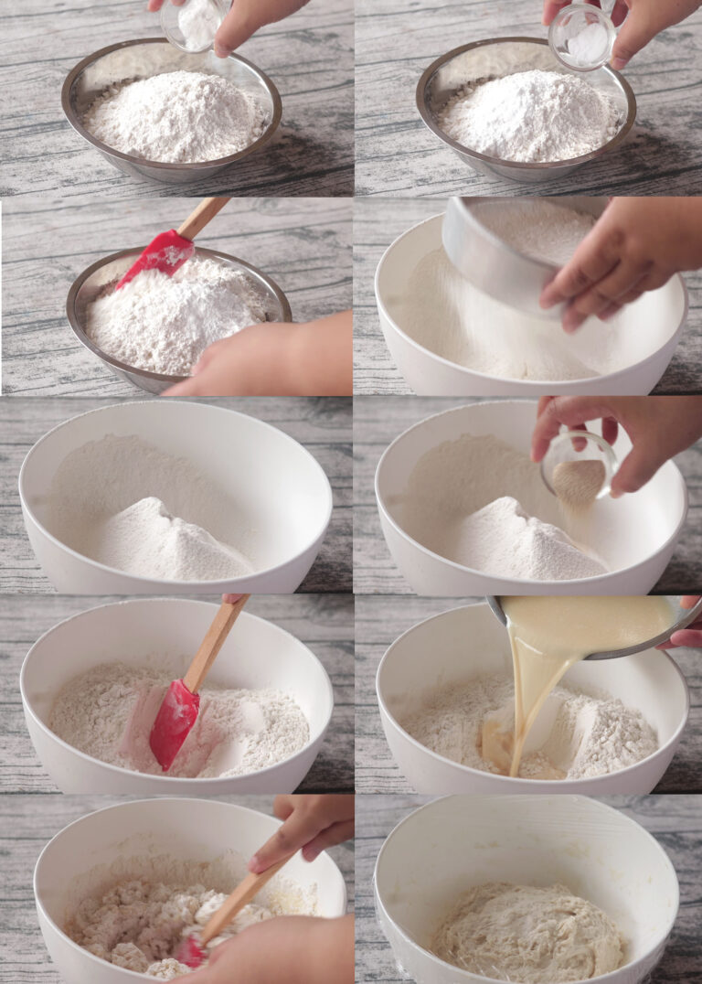 2. ผสมแป้งสาลีเอนกประสงค์หรือแป้งว่าว+ผงฟู+เบกกิ้งโซดา คนให้เข้ากัน จากนั้นนำไปร่อน ใส่ยีสต์ลงไป คนให้เข้ากัน