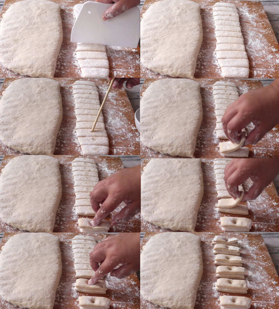 5. ป้าทำแป้งยาวประมาณ 2 นิ้ว และตัดแบ่งแต่ละชิ้นให้ได้ขนาดประมาณ 1/2 นิ้ว แตะนำเล็กน้อยลงบนตัวแป้ง นำอีกชิ้นมาวางประกบ