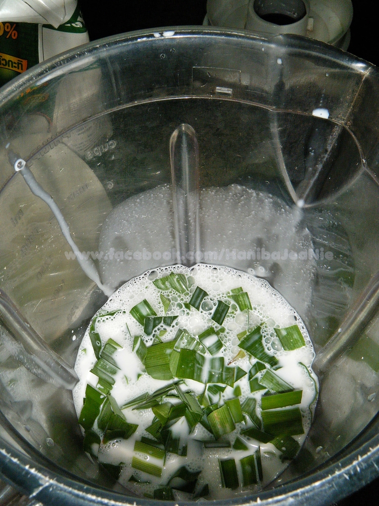 1. ล้างใบเตยให้สะอาด นำมาหั่นใส่โถปั่นค่ะ ถ้าไม่มีโถปั่นอาจจะต้องใช้วิธีโขลกให้ละเอียดกับครกที่สะอาดก็ได้ค่ะ