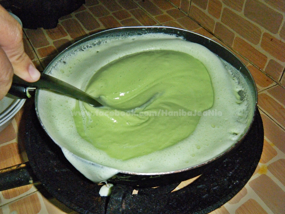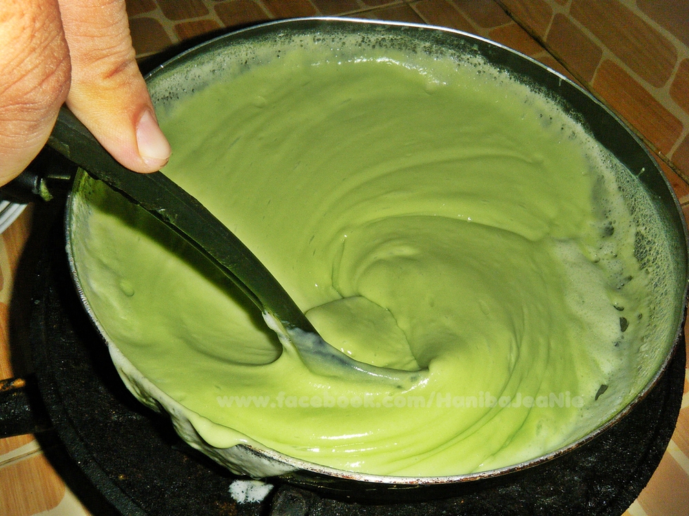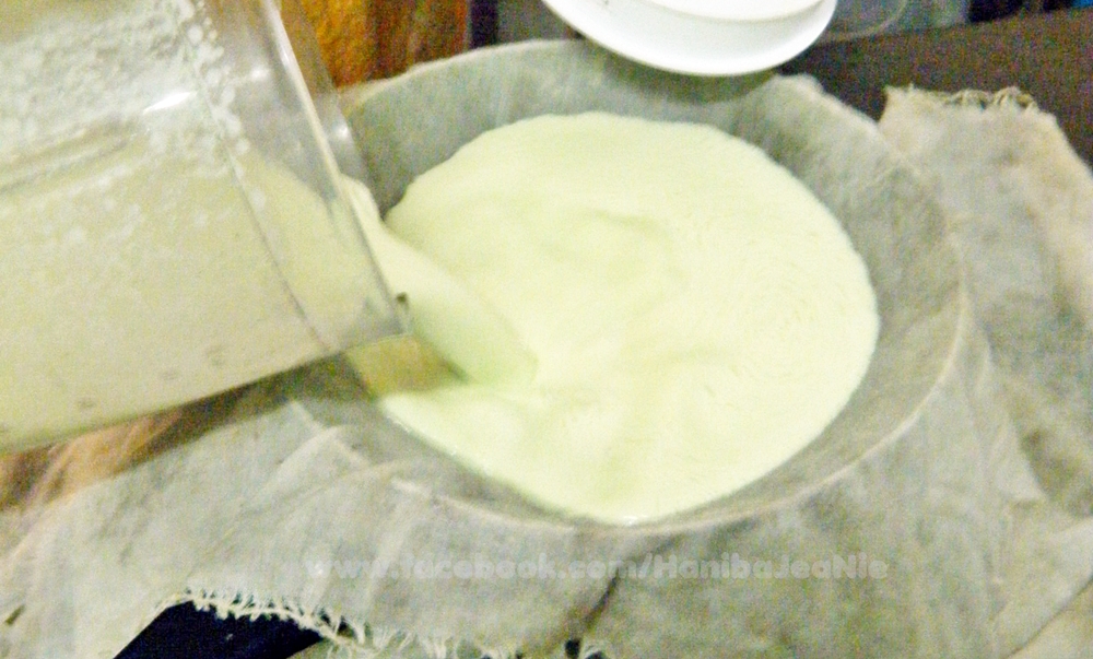 5. นำน้ำใบเตยที่ปั่นกับนมและกะทิ ลงไปในกระทะเคลือบที่เตรียมไข่ น้ำตาล แป้งมัน เอาผ้าขาวบางกรอง แล้วบีบเอากากออก
