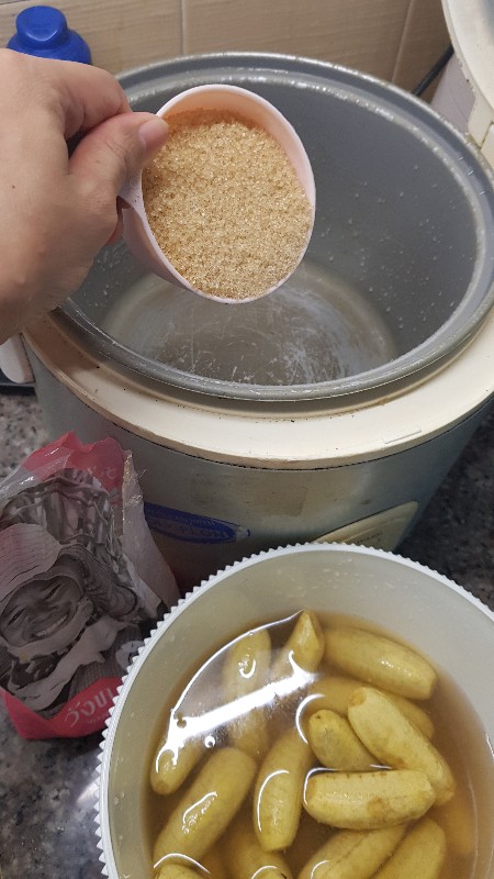ใส่น้ำ น้ำตาล เกลือ ในหม้อหุงข้าว กดปุ่มcook รอให้น้ำเชื่อมเดือด ที่ใช้น้ำตาลสีนวลเพราะมันไม่มีการขัดสี