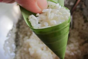 3 ตัดใบตองขนาดประมาณครึ่งนิ้วในทางยาว เอาไว้ทำเป็นรูปกรวย จากนั้นตักข้าวเหนียวที่แช่เสร็จเป็นที่เรียบร้อยใส่ลงไปประมาณ 1 ช้อนชา