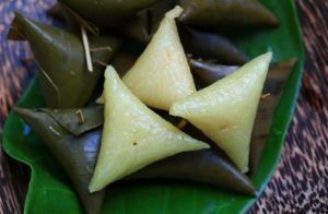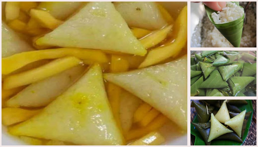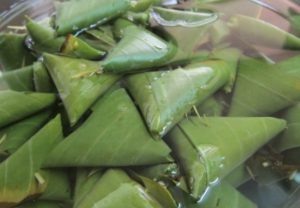 แ ล้วให้พับมุมกลับไปมาเป็นรูปทรงสามเหลี่ยม ดึงใบตองให้แน่นอย่าให้ข้าวเหนียวด้านในหลุดออกมา แล้วให้ใช้ไม้กลัด กลัดเอาไว้
