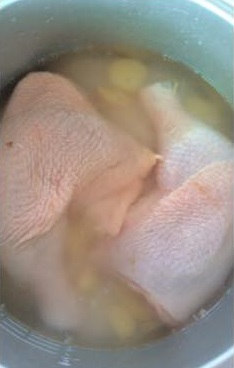 3. ใส่โครงไก่ลงต้ม ใส่เกลือเล็กน้อย พอโครงไก่สุกใส่ฟักแฟงหรือหัวใชเท้าลงไป