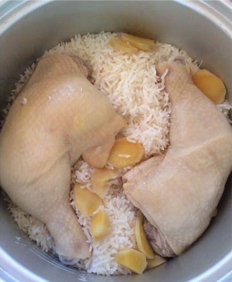 4.นำข้าวที่ผัดเรียบร้อยใส่หม้อข้าว ใส่น่องไก่ที่เตรียมไว้ ใส่น้ำหุงข้าวปกติ (น่องไก่นำไปต้มให้สุกก่อนก็ได้ค่ะ)