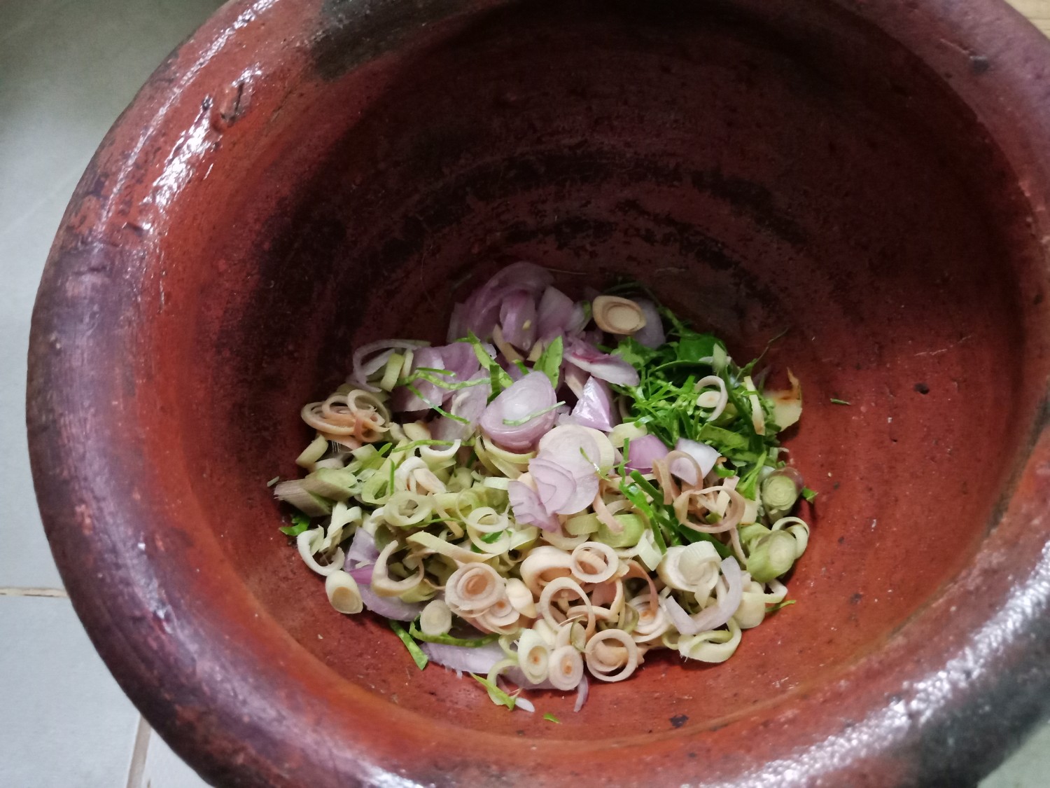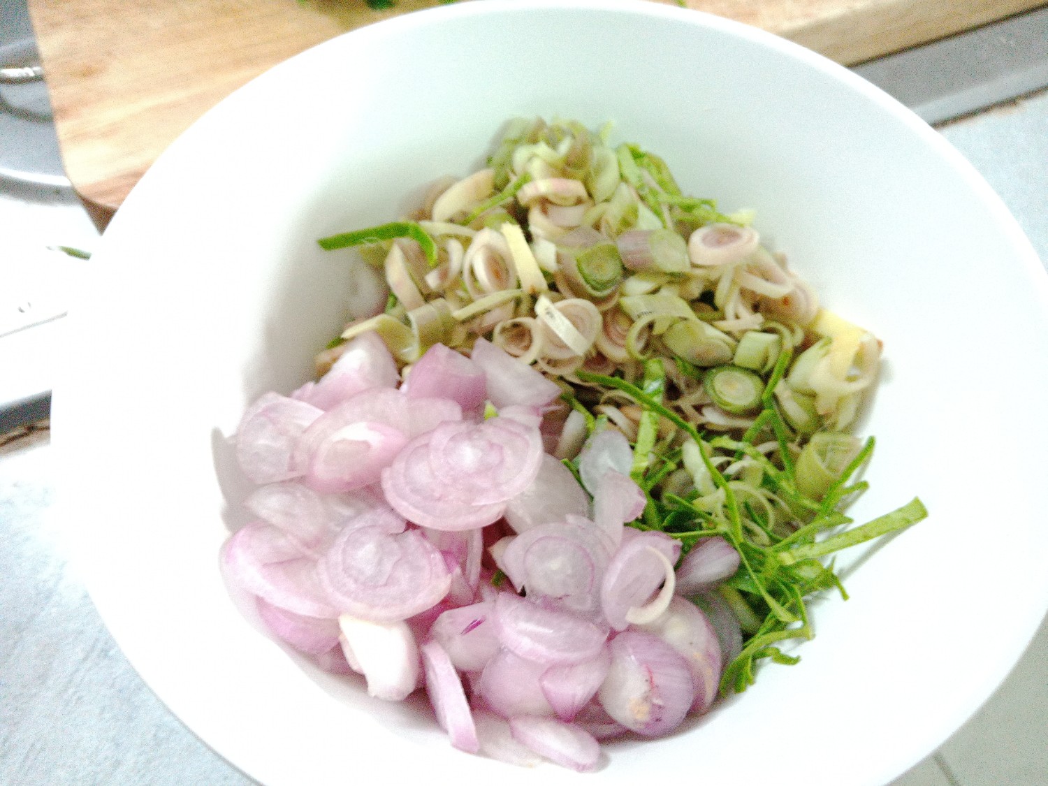 1. ซอยหัวหอมแดง กับตะไคร้ให้ได้ปริมาณเท่าๆ กัน และใบมะกรูด 10 ใบ โขลกรวมกันให้ละเอียดแล้วพักไว้