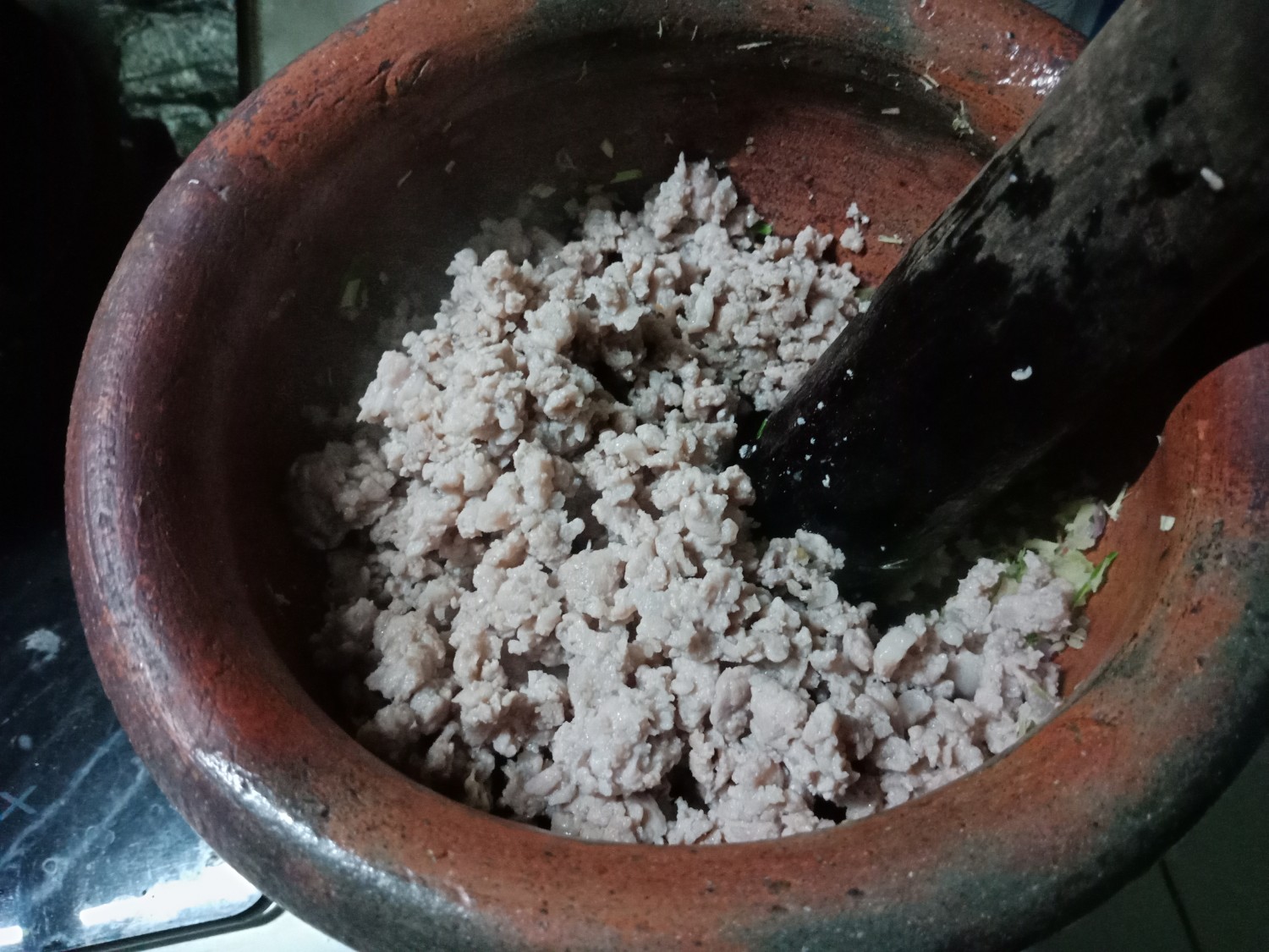 4. เมื่อหมูสุกแล้ว นำไปใส่ในครกที่โขลกเครื่องเทศพักไว้แล้ว