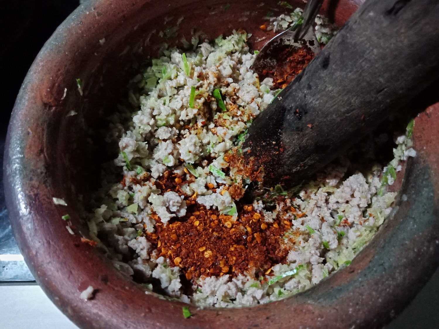 5. โขลกหมูสับกับเครื่องเทศให้เข้ากัน เติมพริกป่นตามใจชอบ คนชอบเผ็ดก็ 3-4 ช้อน คนไม่ชอบก็ 1-2 ช้อน ก็พอแล้วค่ะ