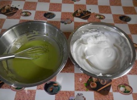 – นำส่วนที่ 2 และ 3 มาผสมกัน โดยแบ่งส่วนไข่ขาวเป็น 3 ส่วน แบ่งตักทีละส่วนลงไปคนเบาๆในแป้ง จนหมด