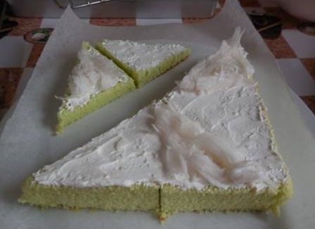 4.นำเค้กที่เย็นแล้วมาปาดวิปครีมให้ทั่ว ใส่มะพร้าวอ่อนที่กวนไว้ จะตัดเป็นชิ้นสามเหลี่ยมหรือสี่เหลี่ยมก็ได้ค่ะ