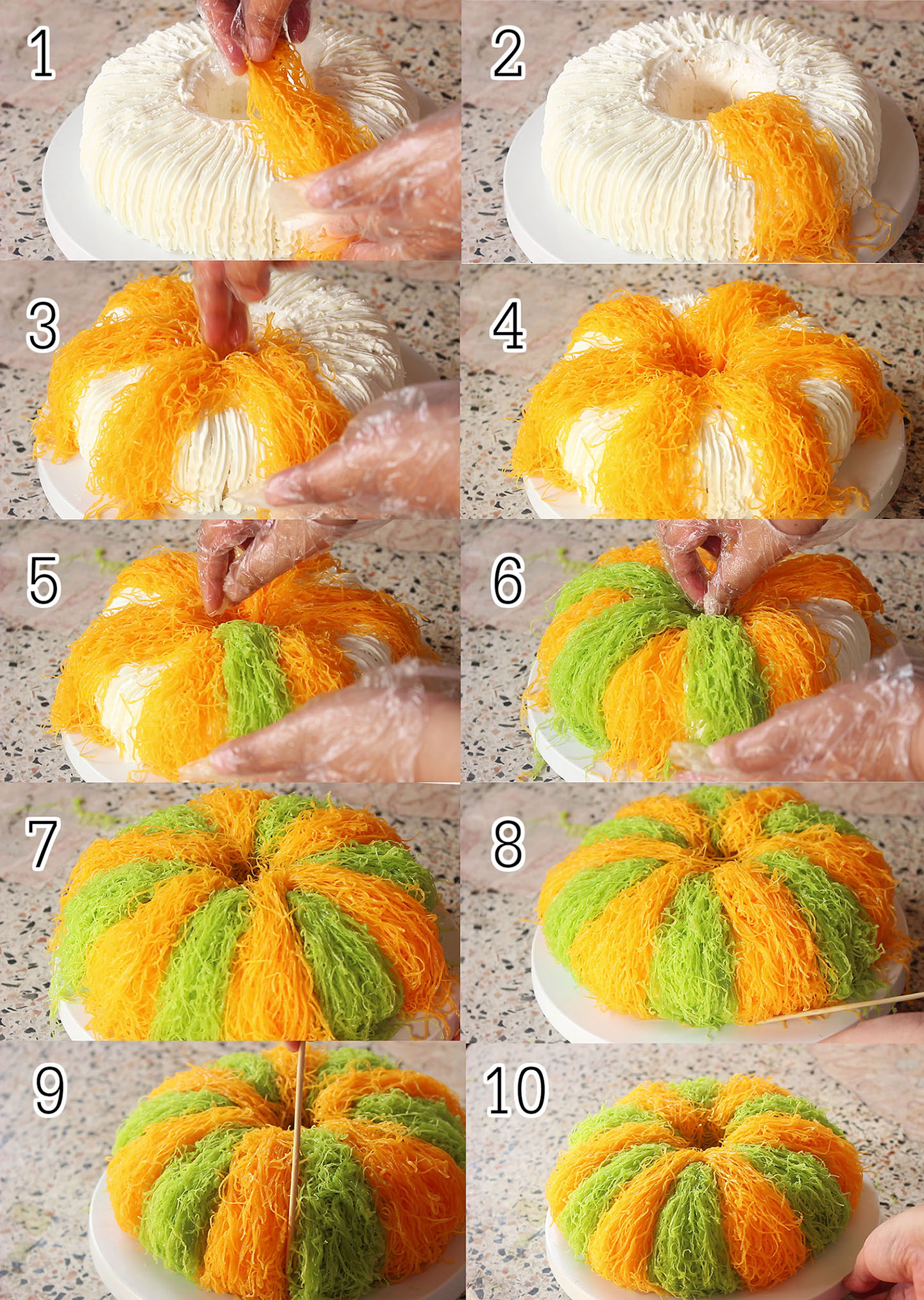 10.วางฝอยทองรอบตัวเค้ก โดยสลับสีกัน ตกแต่งให้รูปทรงสวยงาม