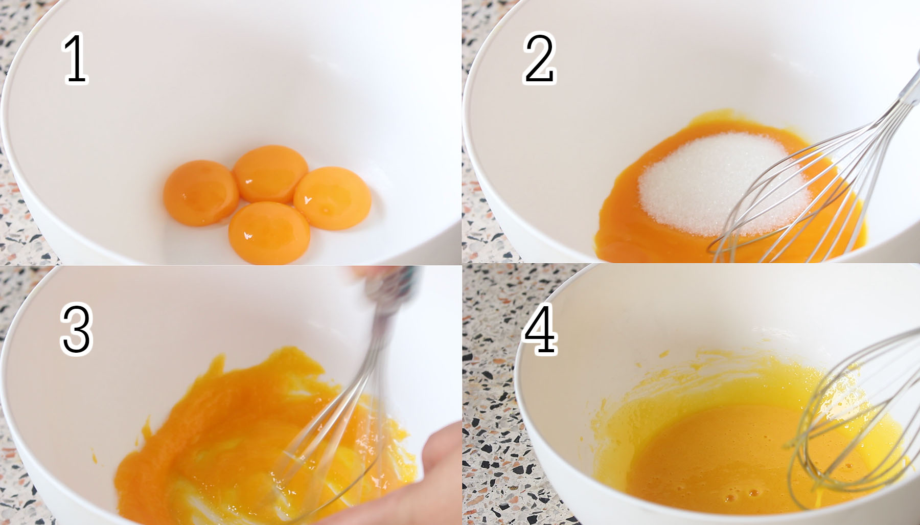 1.ตีไข่แดงกับน้ำตาลจนน้ำตาลทรายละลาย