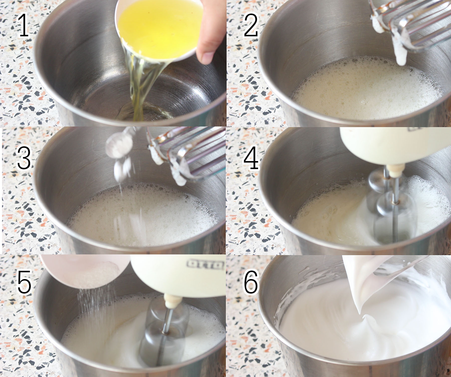 3.ตีไข่ขาวจนเป็นฟองหยาบแล้วใส่ครีมออฟทาร์ทาร์ตีพอเข้ากัน ทยอยใส่น้ำตาลทรายลงไป แบ่งใส่สัก 3 ครั้ง ตีจนตั้งยอด