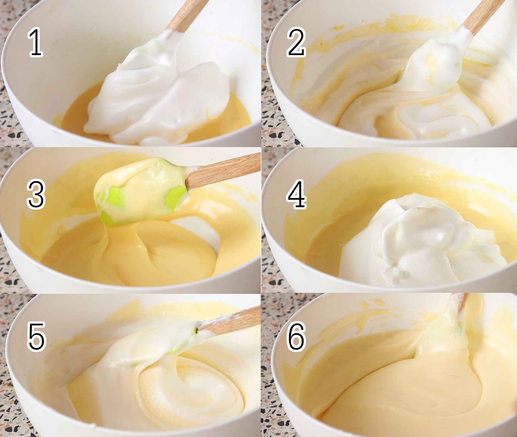4.ตักไข่ขาวมาบางส่วนใส่ชามไข่แดงที่ผสมไว้ ตะล่อมเบาจนเข้ากัน พอเข้ากันแล้วก็ใส่ที่เหลือลงไปตะล่อมจนเนียนเข้ากัน