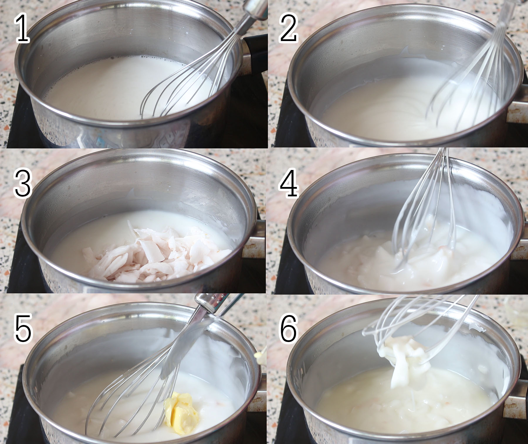 6.เทน้ำมะพร้าว+กะทิ+เกลือป่น+น้ำตาลทราย+แป้งข้าวโพดหรือแป้งกวนไส้ลงไปในหม้อ คนให้ทุกอย่างละลายเข้ากัน