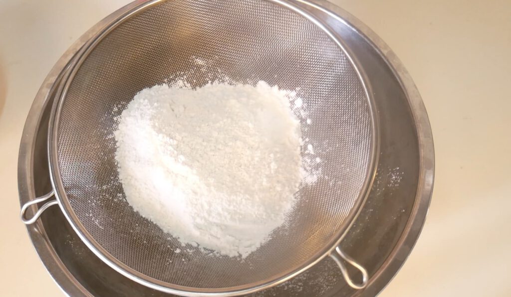 1.ร่อนแป้งทั้ง 3 ชนิดลงชามผสม