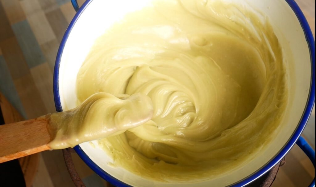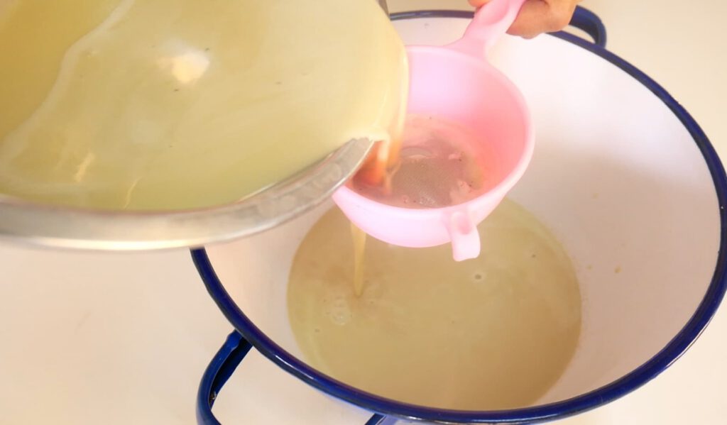 3. ใส่กะทิและน้ำใบเตย สีผสมอาหารสีเขียว คนให้เข้ากัน นำไปกรองเพื่อเอาเศษแป้งที่ละลายไม่หมดออก