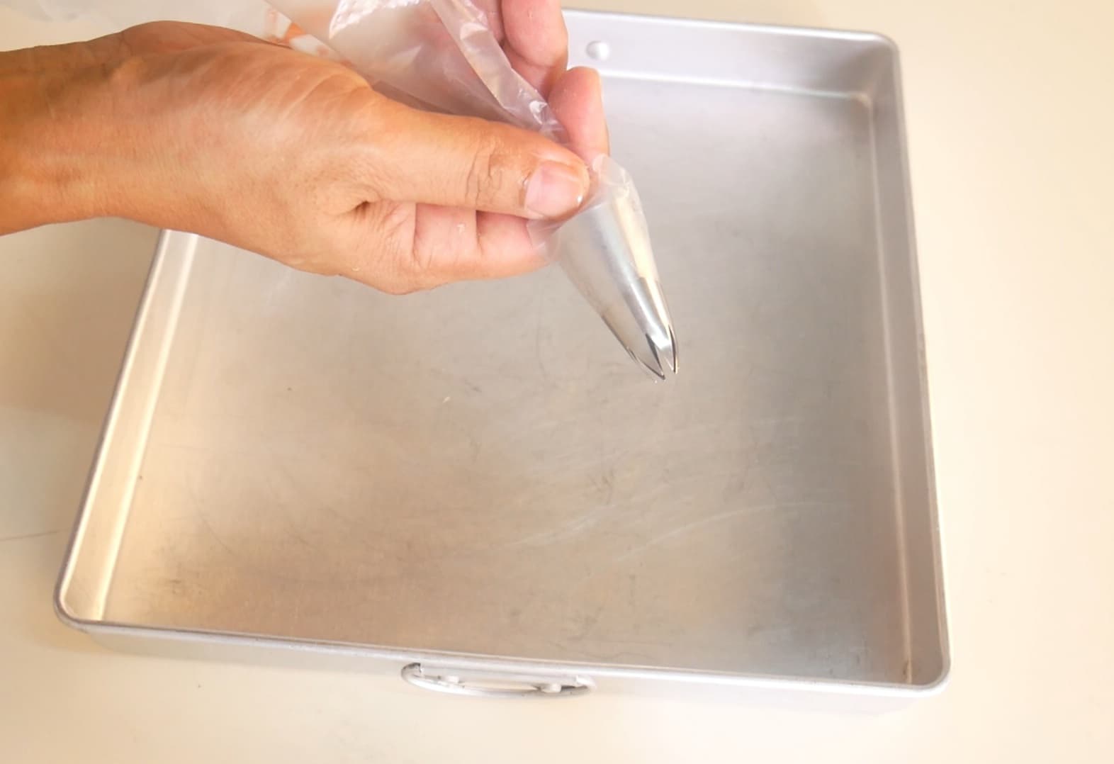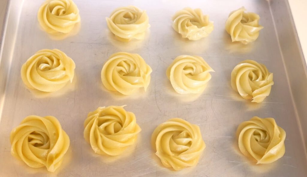 5. เมื่อสุกแล้ว รอให้คลายร้อน ใส่ถุงบีบ ใช้หัวบีบ 1M ในการบีบดอกค่ะ ทาน้ำมันที่ถาดเล็กน้อยก่อนบีบ