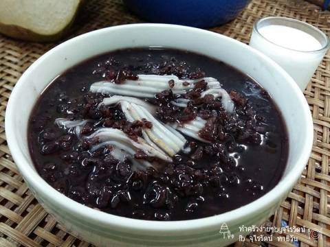 1.ตั้งน้ำเปล่าในหม้อต้ม สะเด็ดน้ำข้าวเหนียวดำที่แช่ไว้ ใส่ลงไปต้มในหม้อ ใช้ไฟแรง ต้ มไปเรื่อยๆ ถ้าน้ำงวดลงก็เติมน้ำเพิ่มทีละน้อยๆ