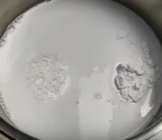4.เตรียมน้ำกะทิ ผสมเกลือ และแป้งข้าวจ้าว ลงไปคนผสมให้เข้ากัน