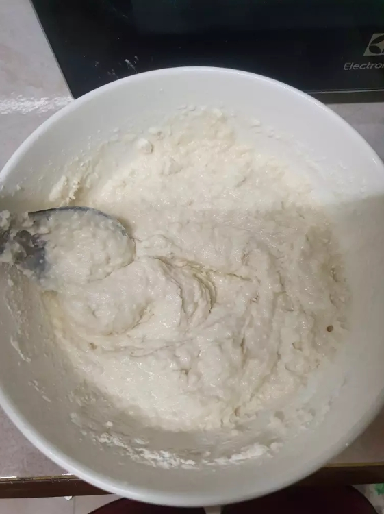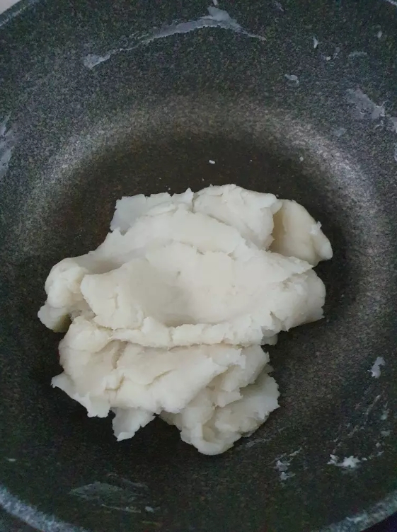 1.นำแป้งเค้ก น้ำตาล กะทิผสมกัน ตั้งเตา กวนไฟอ่อนๆ จนแป้งสุก ไม่ติดกระทะ