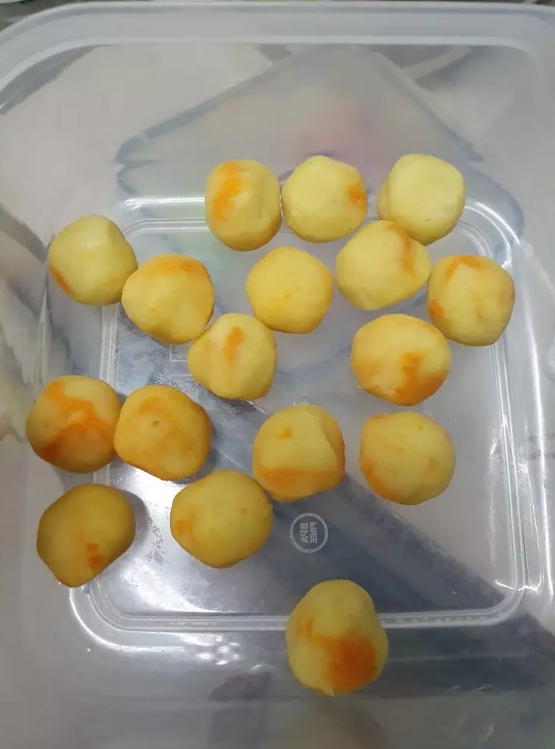 4.ไส้ถั่ว พอดีรอบนี้เรามีถั่วกวนจากการทำขนมอื่น เป็นไส้ถั่วกวนไข่เค็ม เลยนำมาใช้ แบ่งไส้ลูกละ 10 กรัม ในส่วนของไส้