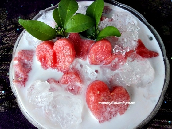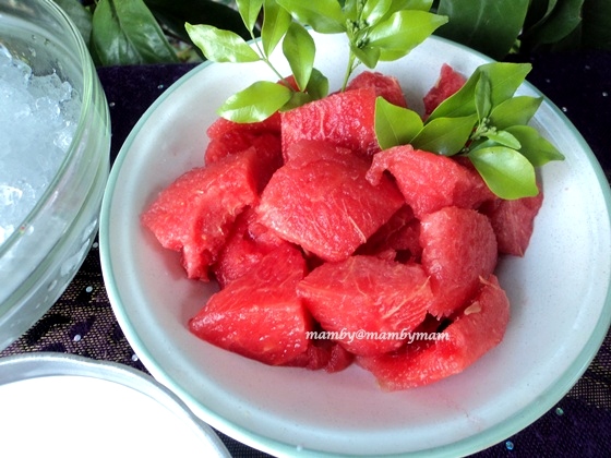 1.นำกะทิผสมกับน้ำตาล+เกลือ ชิมรสตามต้องการ ตักแตงโมที่หั่นไว้ใส่ถ้วย