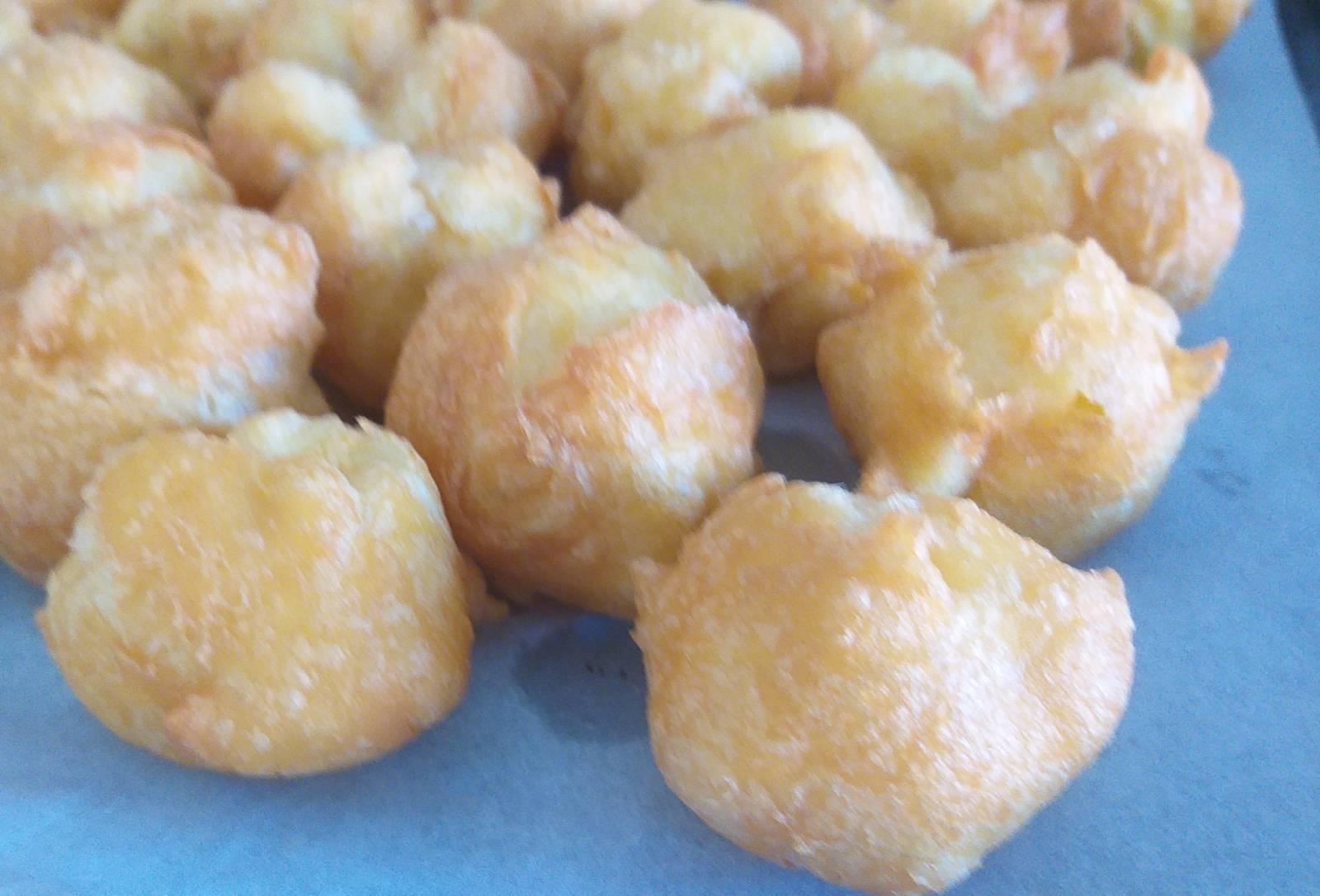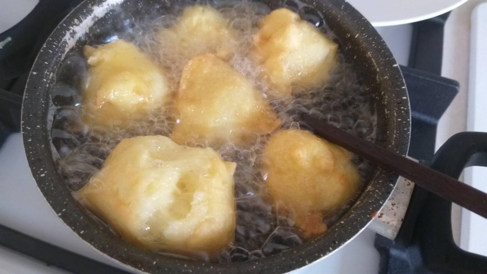 เมื่อทอดไปสักพักขนมจะพองตัวเป็นก้อนใหญ่ขึ้น 2 เท่า เกิดเป็นโพรงด้านในขนม