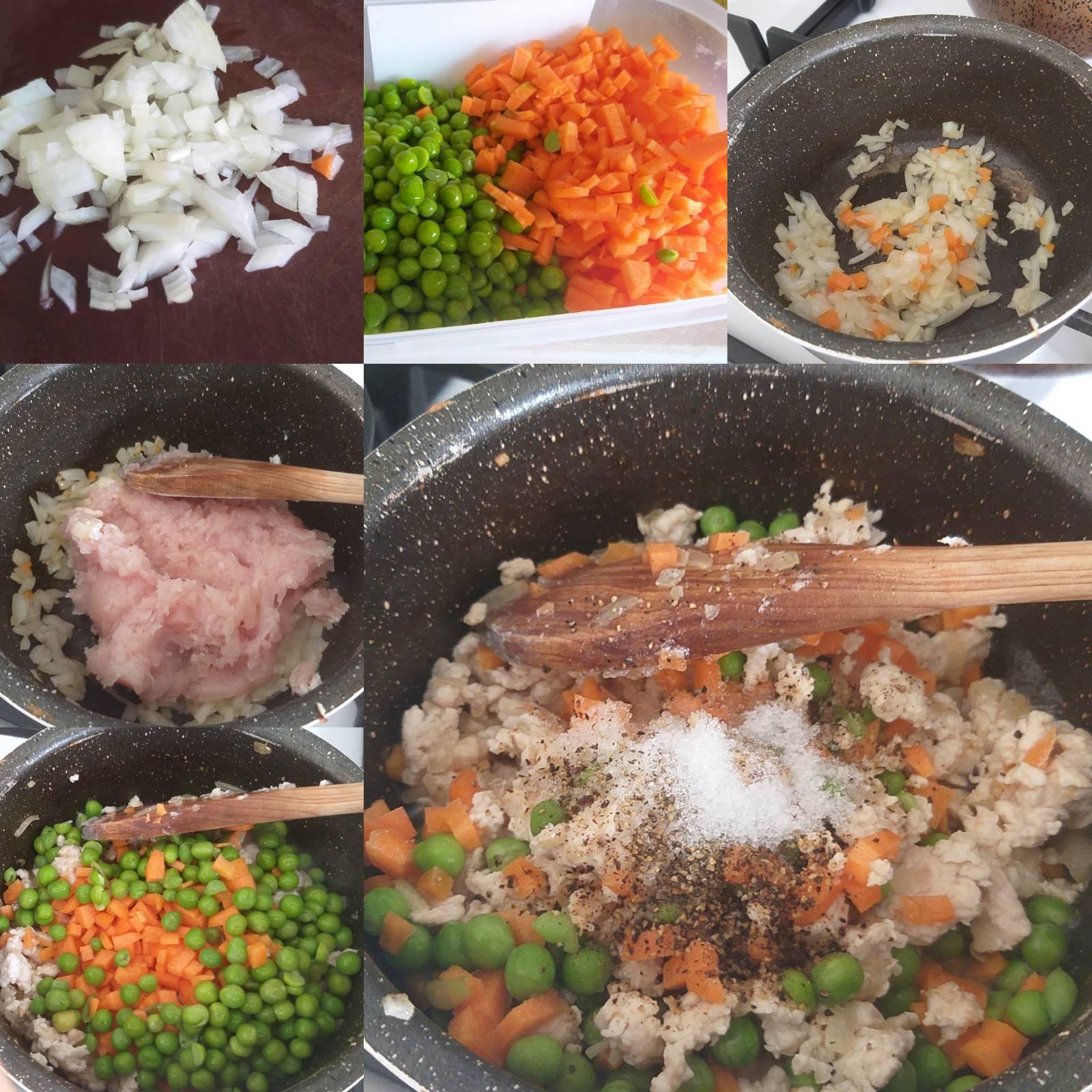 ผัดหอมสับในน้ำมันพืชพอสะดุ้งจากนั้นใส่ไก่บดลงไปผัดให้ไก่ส่งแล้วเติมแครอทและถั่วลันเตาลงไปผัดรวม พอผักสุกได้ที่เติมแป้งสาลี