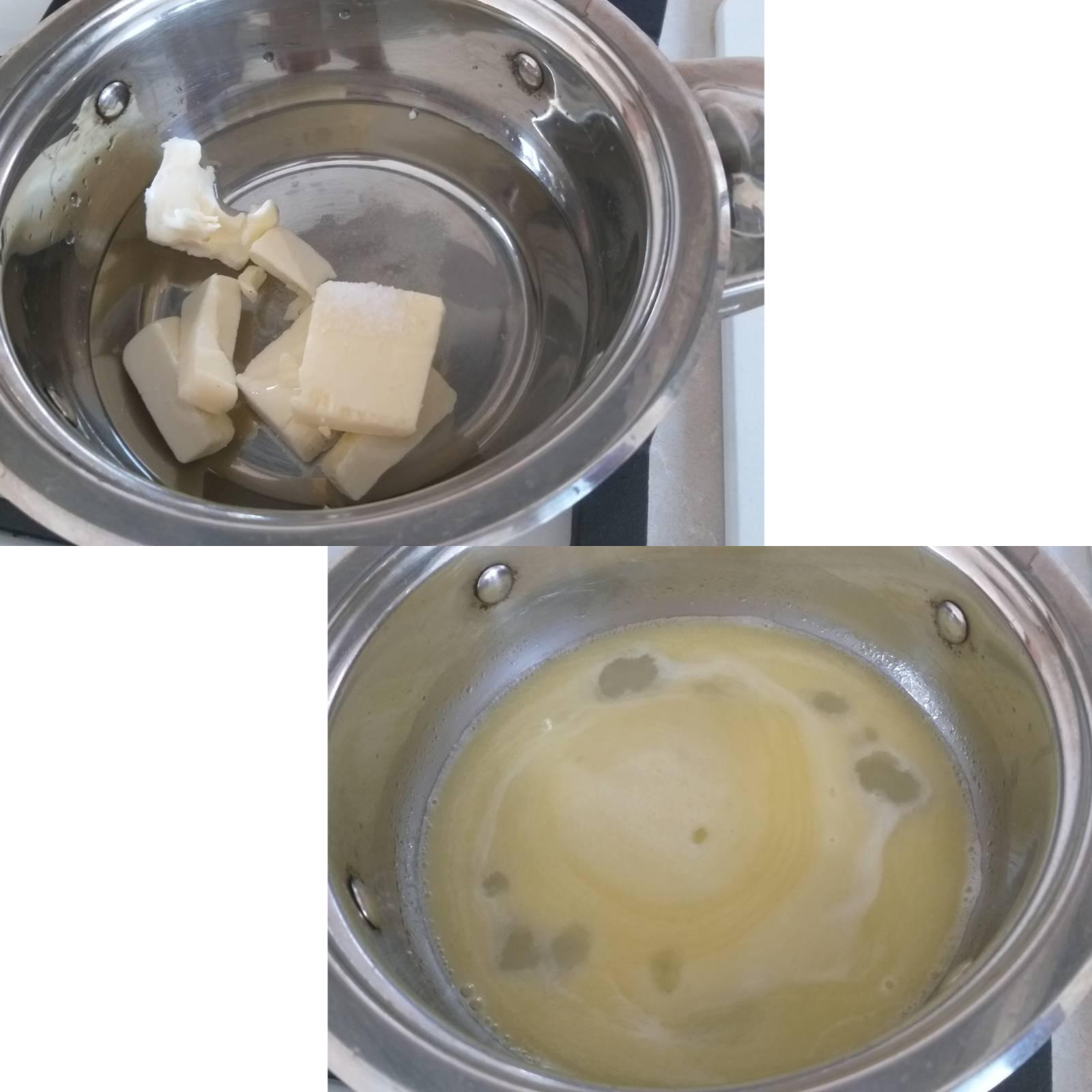 1. นำเนย เกลือ และน้ำเปล่า ใส่หม้อขึ้นตั้งไฟให้ส่วนผสมละลาย