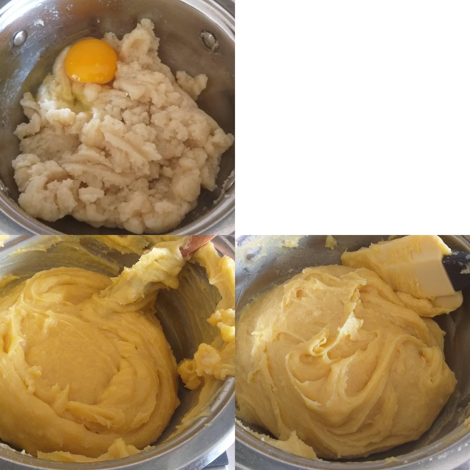 และนมสดผัดให้แป้งสุกและเหนียวดีแล้วยกลงทิ้งให้คลายความร้อนแล้วตักไส้ขนมที่เตรียมไว้ใส่ในตัวขนม