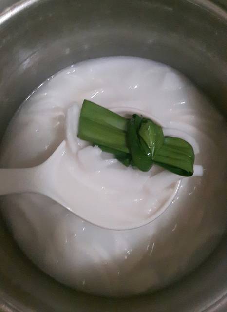 3.ส่วนหวาน นำแป้งมันหรือแป้งท้าวมาผสมกะน้ำตาลทราย น้ำลอยดอกมะลิ (หรือกลิ่นมะลิ)คนให้ละลาย แล้วนำไปตั้งไฟ ให้แป้งสุก