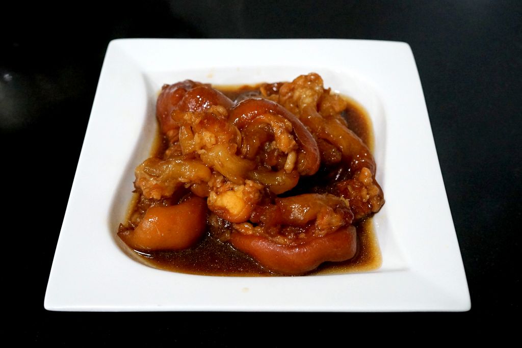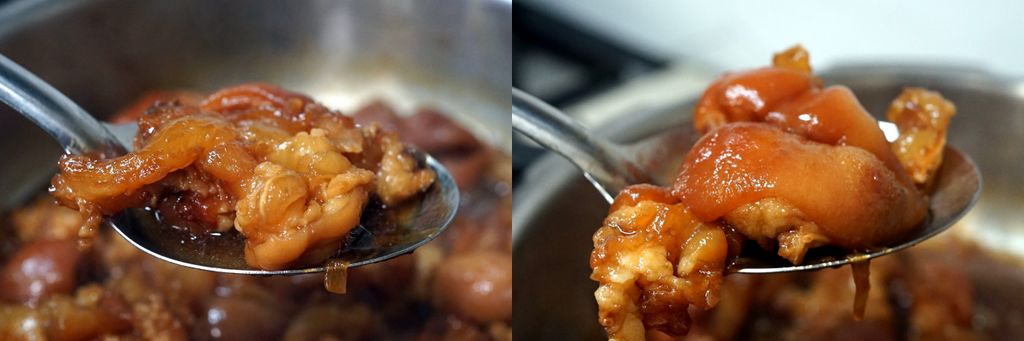 5. เติมเหล้าจีนลงไป 1/2 ถ้วย ปิดฝา ต้มด้วยความดัน 30 นาที เอ็นหมูเปื่อยพอดี