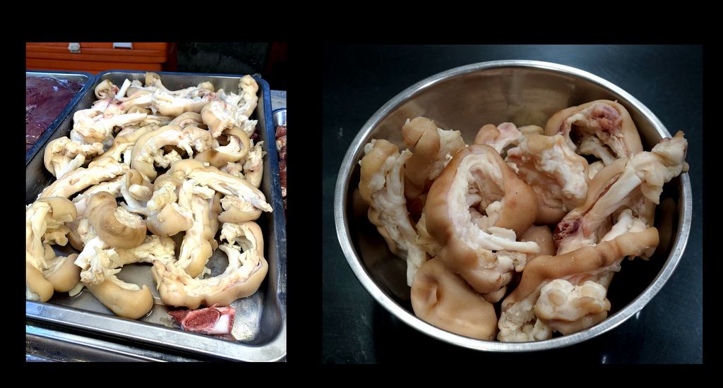 1. เอ็นหมู (ภาพซ้าย) จะมีขายที่เขียงหมูบางเขียง ที่ตลาดสี่มุมเมือง เป็นเอ็นหมูที่เลาะมาจากขาหมู ทางเขียงต้มทำความสะอาดมาให้แล้ว