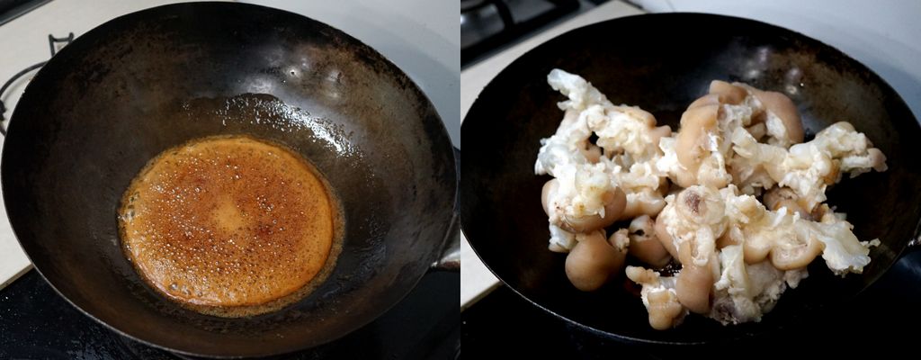 ของน้ำตาลลงไป เคี่ยวจนเป็นเนื้อเดียวกัน ใส่เอ็นหมูลงไป คลุกให้เข้ากัน