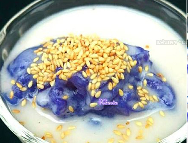 5. จัดเสิร์ฟโดยการนำกะทิราดลงบนตัวเปียกปูน โรยงาขาวคั่ว เป็นอันเสร็จเรียบร้อย