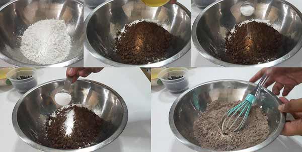1. ผสมของแห้งเข้าด้วยกัน ได้แก่ แป้ง เกลือ เบกกิ้งโซดา ผงฟู และผงโก้โก้ คนให้เข้ากัน