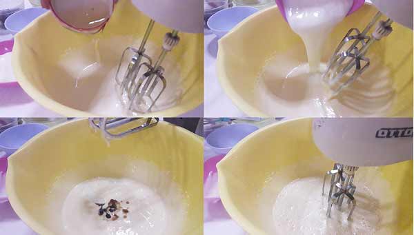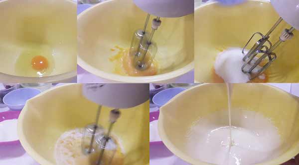 2. ตีไข่ไก่กับน้ำตาลทรายจนน้ำตาลละลาย และกลายเป็นครีมสีขาว