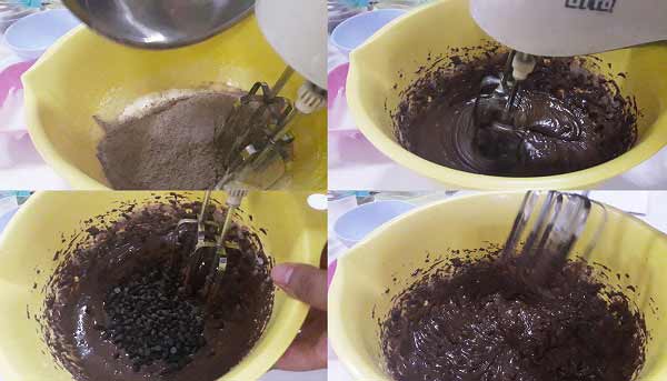 4. ใส่ของแห้งลงไป ตะล่อมเบา ๆ ก่อนเปิดเครื่อง แล้วตีด้วยความเร็วต่ำจนเข้ากัน เติมช็อกโกแลตชิพลงไปตีพอเข้ากัน