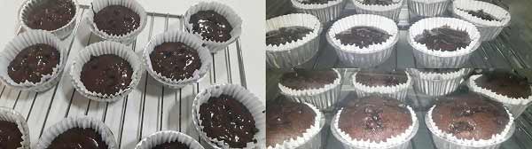 5. ตักใส่ถ้วยพิมพ์ที่เตรียมไว้ โรยหน้าด้วยช็อกโกแลตชิพ แล้วนำไปอบที่อุณหภูมิ 175 องศาเซลเซียส เป็นเวลา 25-30 นาที