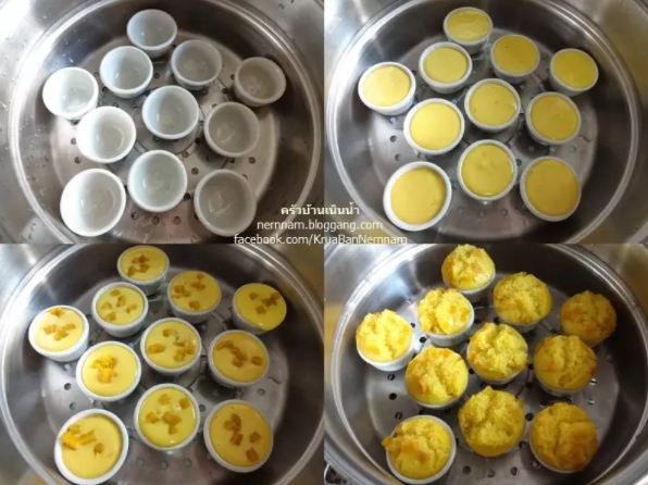 5.ตั้งน้ำให้เดือดจัด นึ่งถ้วยให้ร้อนก่อน แล้วจึงใส่ส่วนผสมที่เตรียมไว้ลงไป ถ้าต้องการโรยหน้าด้วยเนื้อฟักทอง ใช้ฟักทองนึ่งเกือบสุก