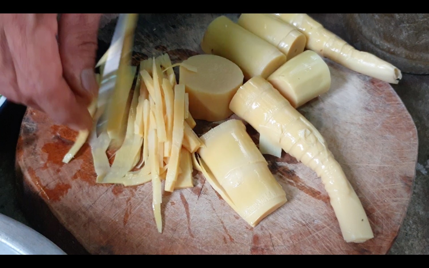 1. นำหน่อไม้ไปต้มให้สุกก่อน แล้วเอามาหั่นเป็นเส้นๆ แบบนี้ค่ะ ส่วนที่แก่เราไม่ใช้ค่ะ