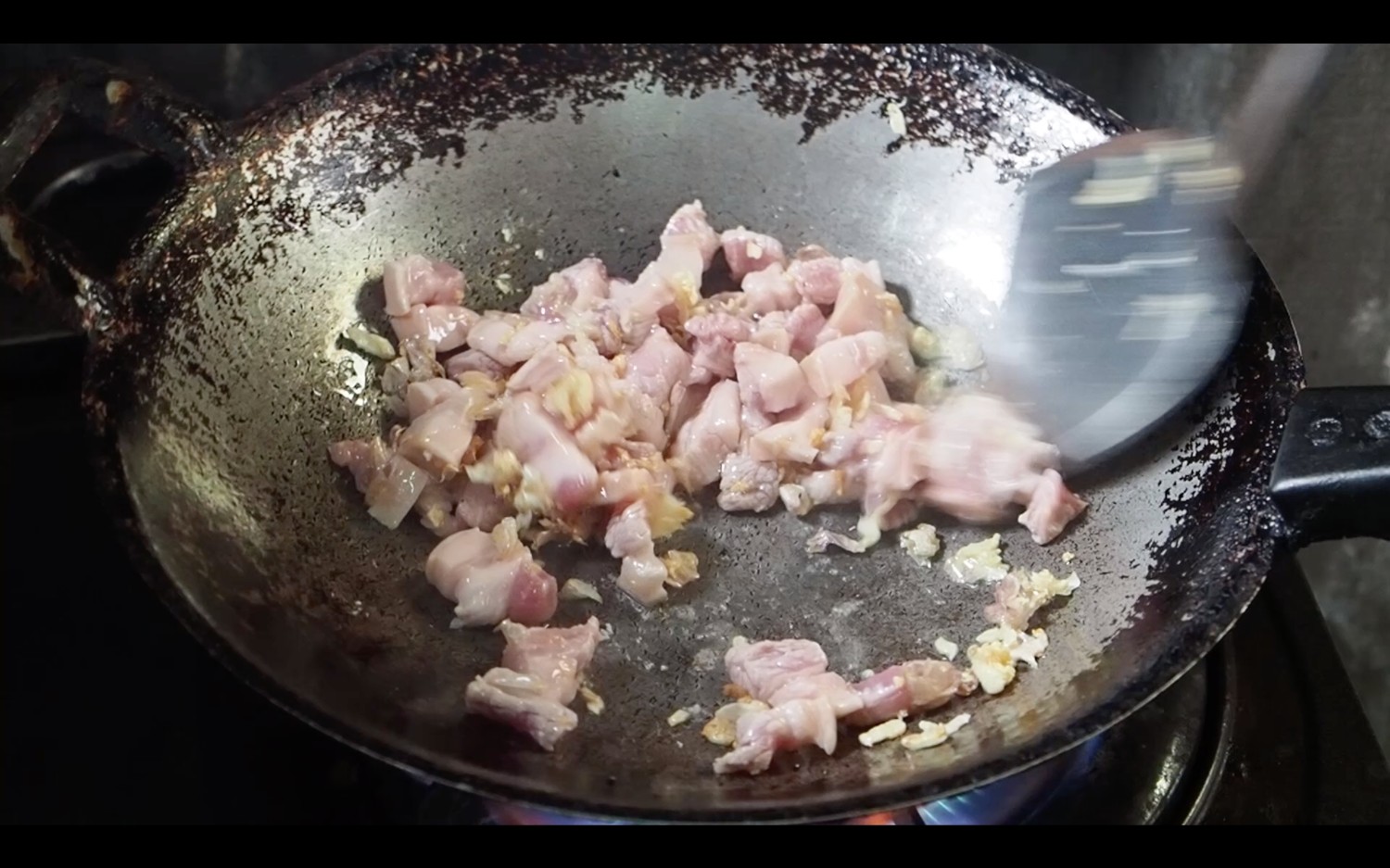 5.วันนี้พ่อใช้กระทะบ้านๆ ในการผัด ใช้มาสามปีหน้าตาก็จะประมาณนี้ค่ะ ห้าาา ให้ลองใช้กระทะเทฟลอนก็ไม่เอา บอกไม่ถนัด