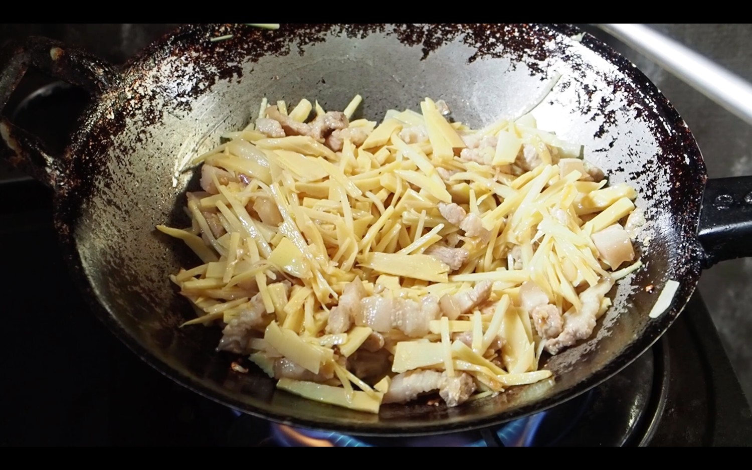 7.พอหมูเหลืองได้ที่ตามภาพบน ใส่หน่อไม้ลงไปผัดให้เข้าเนื้อนะคะ ผัดนานหน่อย