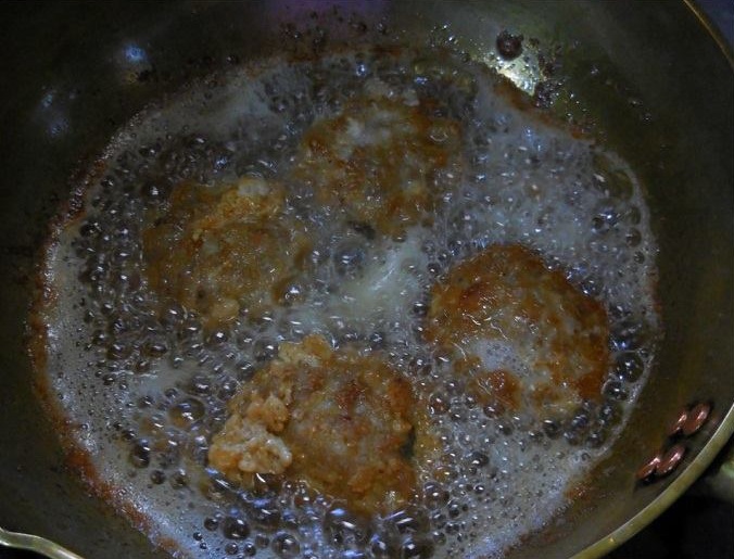 – ใช้ช้อนโต๊ะ 2 คันตักส่วนผสม กดเป็นชิ้นกลมแบน นำไปทอดให้สุกเหลืองทั้งสองด้าน (ใช้ไฟกลางๆ) พักให้สะเด็ดน้ำมัน