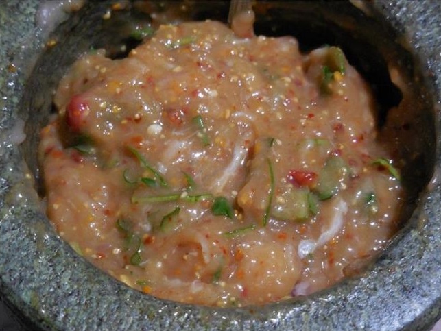 – โขลกเนื้อปลาตองในครก ทยอยใส่น้ำปลาร้าลงไป โขลกจนเนื้อเนียนดี ใส่ข้าวคั่ว พริกป่น ข่าสับ น้ำปลา และผักต่างๆในข้อ 7 ลงไป