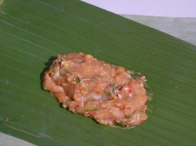 – คนส่วนผสมให้เข้ากัน ตักใส่ใบตอง กลัดด้วยไม้กลัด