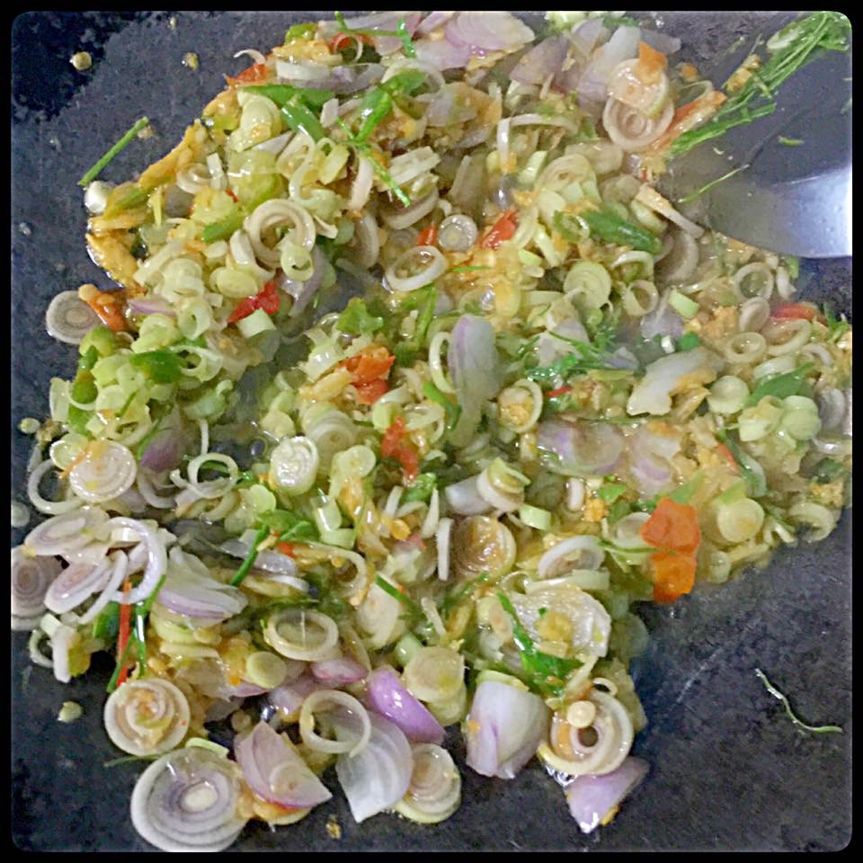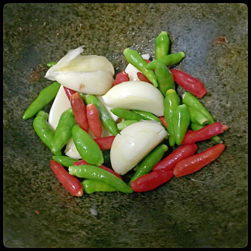 ตั้งกะทะใส่น้ำมันเล็กน้อย โยนพริกกับกระเทียมที่เราโขลกไว้ลงไปค่ะ ผัดจนหอม ตามด้วยตะไคร้ซอย